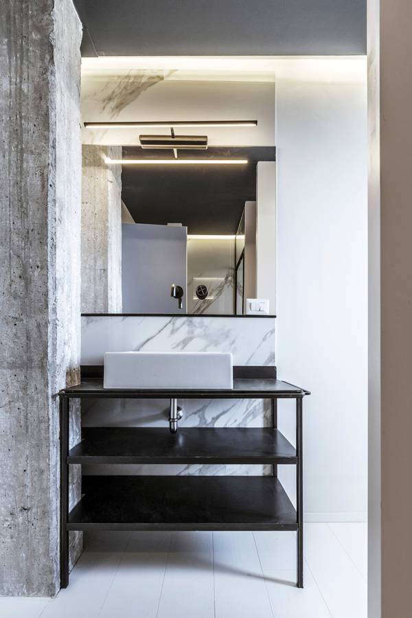 Alcuni particolari lasciati al grezzo sono stati combinati con ceramiche effetto marmo di grande formato. La scelta del ferro per molti dettagli risulta in equilibrio con la scelta di materiali e componenti del bagno.