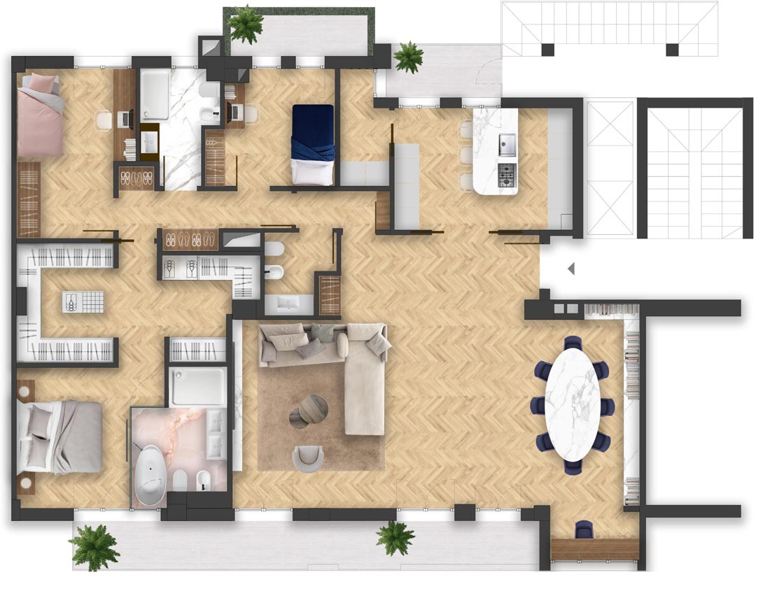 L’esigenza principale era di avere una grande cabina armadio, una camera padronale con bagno, una grande cucina e soprattutto un ampio soggiorno.