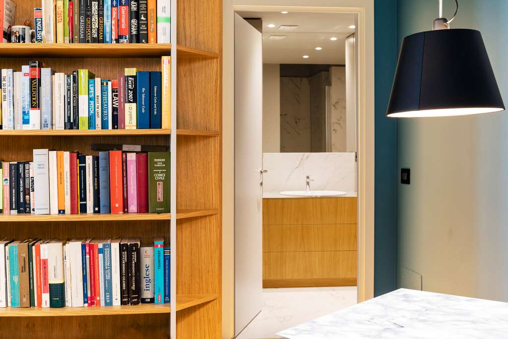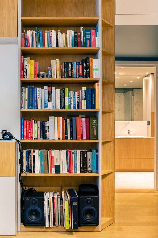 Mensole, totem, librerie a scomparsa generano equilibrio attraverso anche la scelta di cromie studiate e volute fortemente.