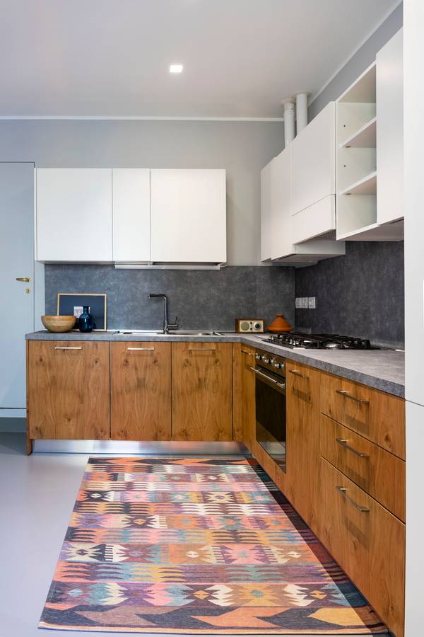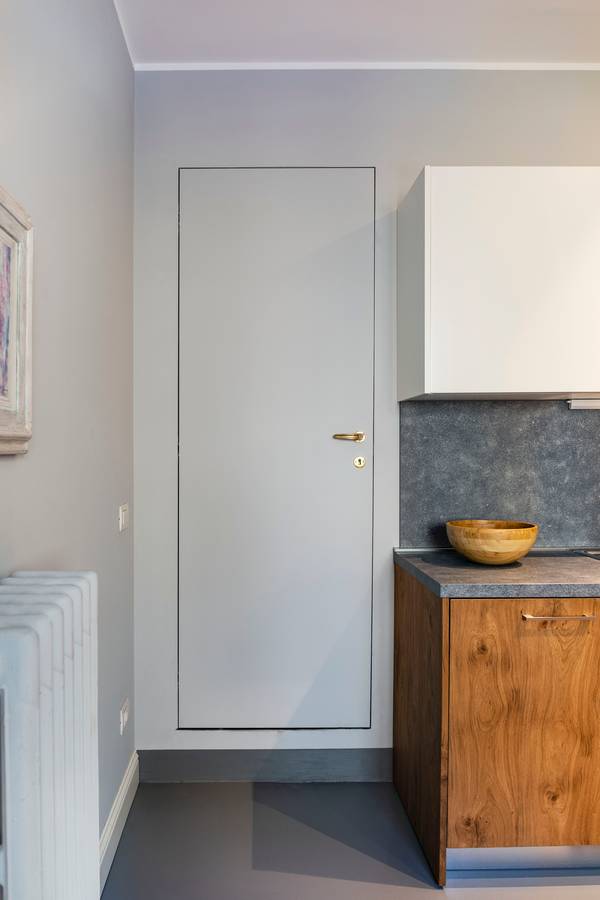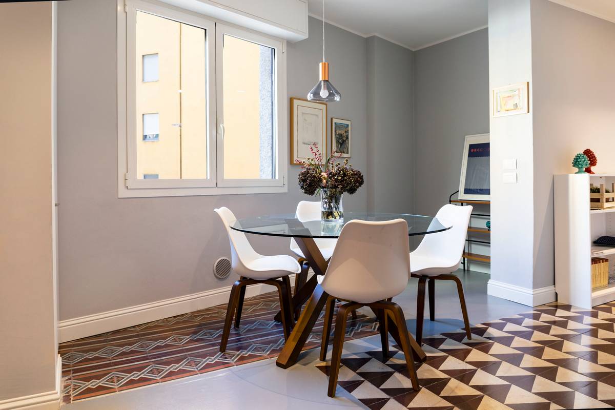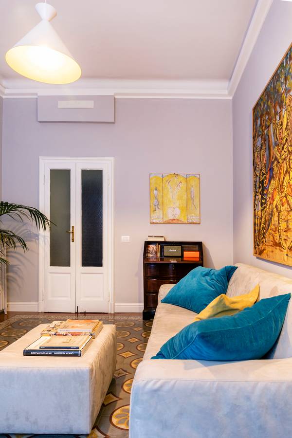 L’appartamento si colloca in una zona già residenziale tra Piazza Napoli e Via Washington, oggi di particolare interesse in quanto snodo della nuova metropolitana M4. La superficie dell’immobile si sviluppa su circa 85 mq . La ristrutturazione si articola nel recupero parziale di alcune caratteristiche dell’immobile e cerca di stravolgere l’assetto precedente della casa. Da una parte il restauro di alcuni rivestimenti ritrovati, le porte e i soffitti, dall’altra l’ampliamento dei servizi e della zona living cucina anche attraverso l’apertura di una finestra che garantisce la doppia esposizione dell’appartamento. Sono stati recuperati e rimessi a nuovo i rivestimenti originari come le marmette presenti sotto molti interventi posteriori e si è cercato di rendere il tutto il più omogeneo possibile attraverso la posa di una livellina grigia effetto resina. La luce naturale è stata notevolmente incrementata attraverso l’apertura di una finestra. Il nuovo layout luci ha seguito il disegno del controsoffitto. Le tinte chiare scelte si combinano perfettamente rispetto alle peculiarità di alcuni pavimenti. La scelta dei materiali è stata condizionata dalla necessità di rendere più omogeneo possibile la pavimentazione attraverso la livellina; l’unica particolarità si trova nel bagno padronale, nel quale si è optato per un teak marino.
