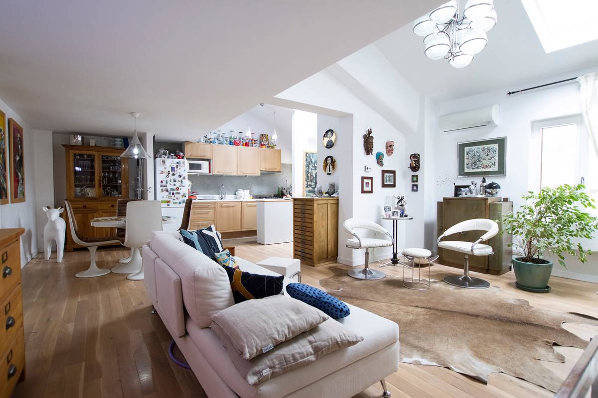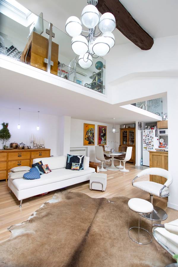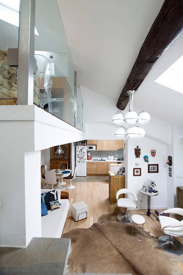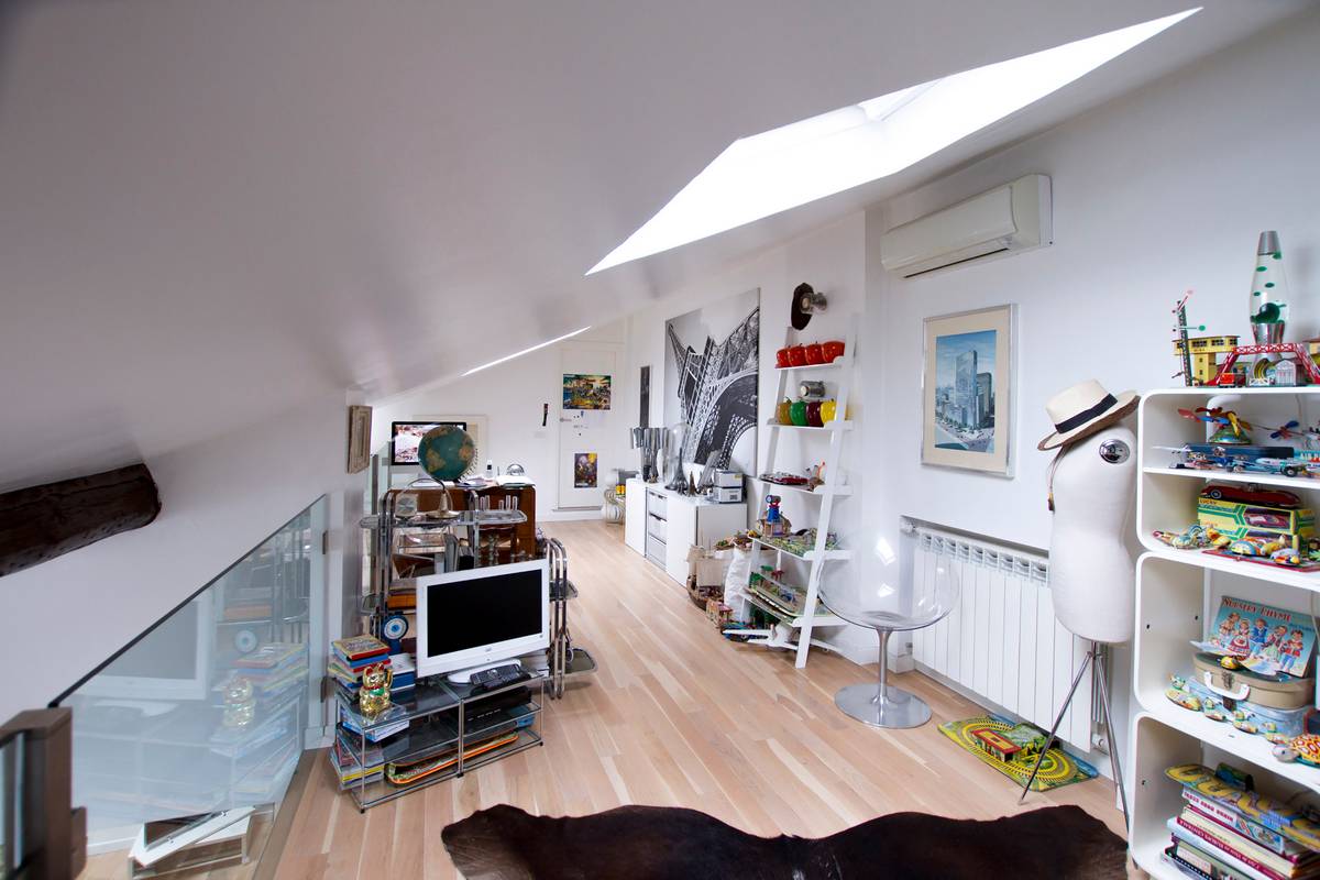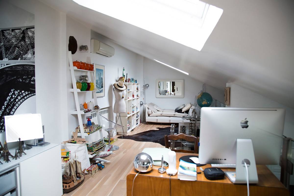 È stato usato prevalentemente il bianco per le pareti, per mettere in risalto la struttura originaria del tetto e le opere d’arte dei proprietari, collezionisti di arte moderna e modernariato.