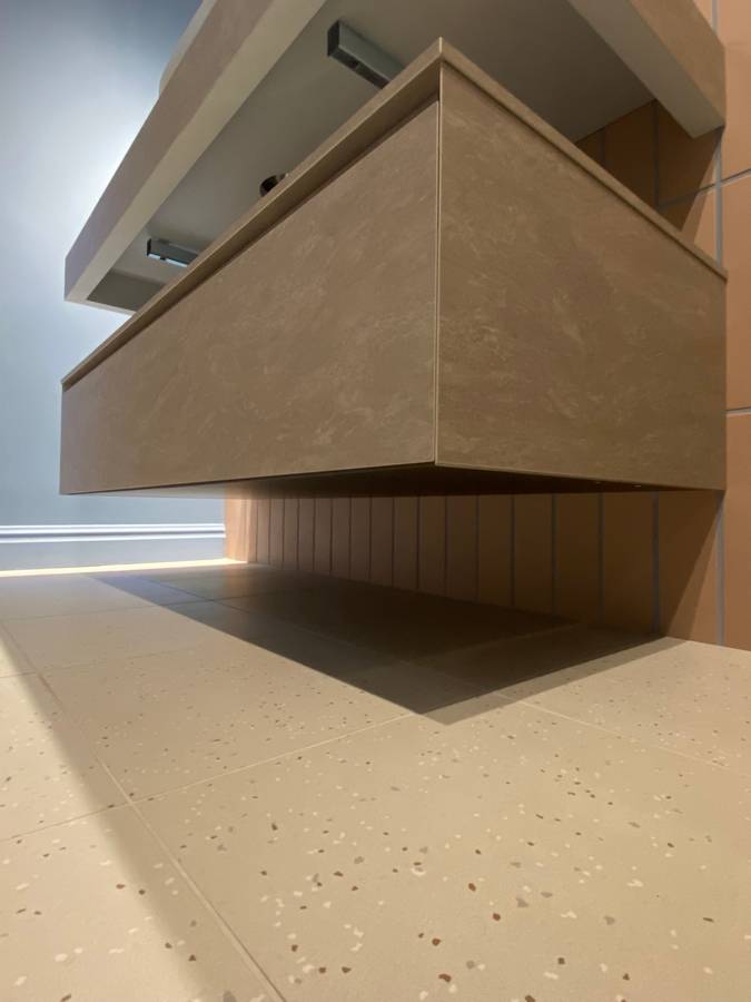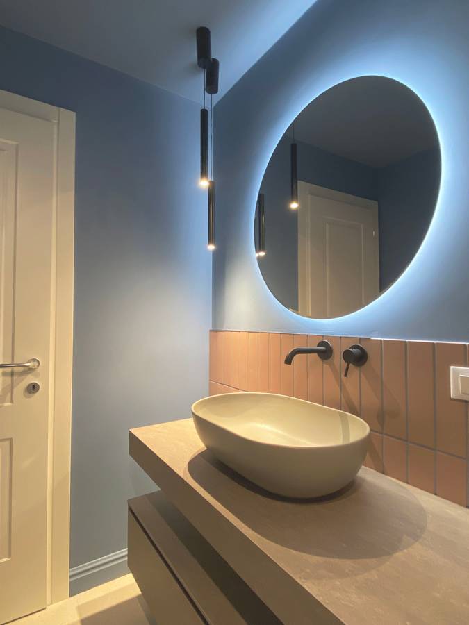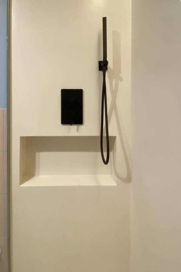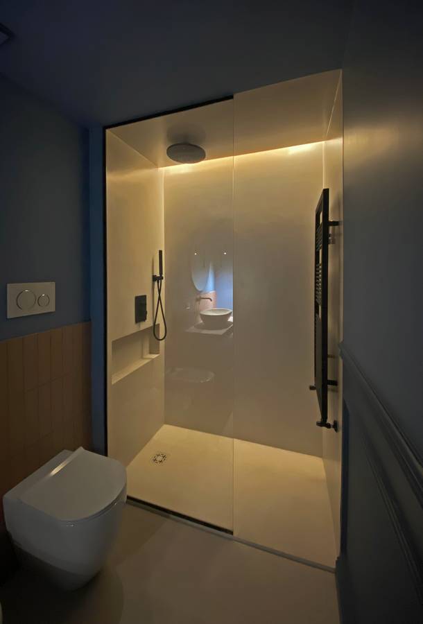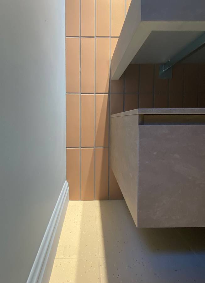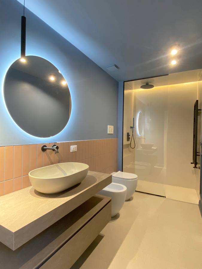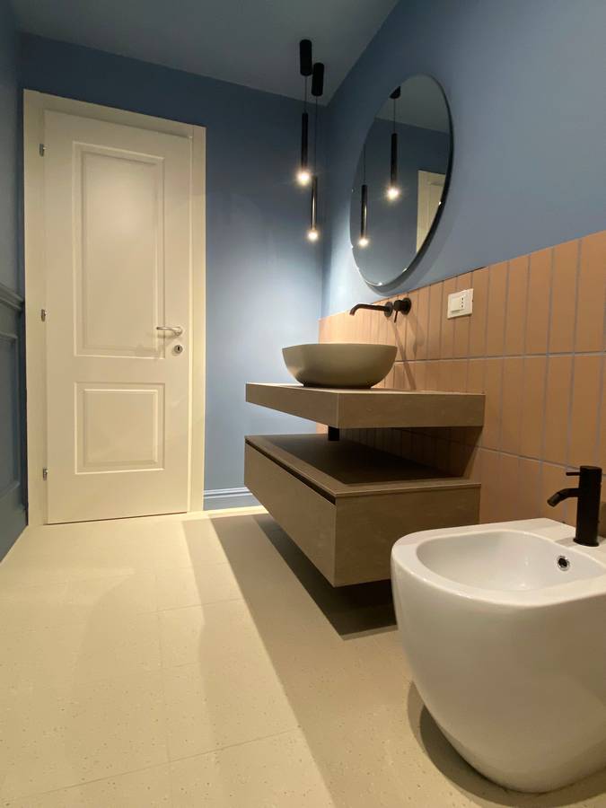 I clienti chiedevano un restyling degli spazi giocando con finiture e colori; il bagno è stata l’occasione per utilizzare materiali nuovi come la resina accostata a cementine effetto graniglia dall’aspetto retrò.
