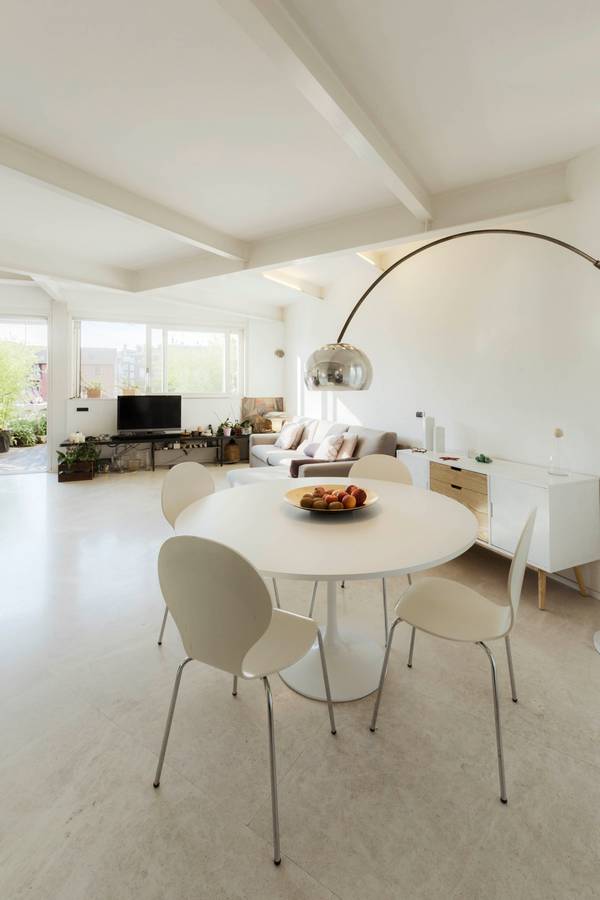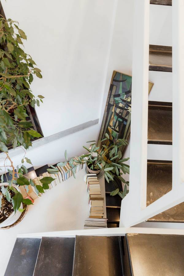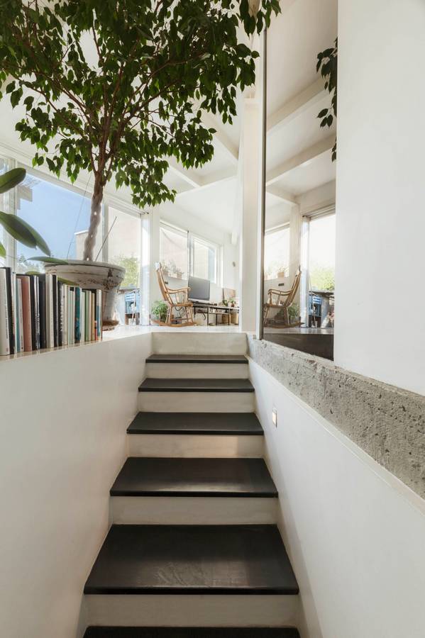 Una costante illuminazione è garantita dalle ampie vetrate che permettono alla luce naturale di irradiare gli spazi del living-soggiorno. I colori sono dati dal tipo di materiale utilizzato. Calce, smalto lucido e opaco, tempera: tutti colori chiari che conferiscono un ritmo sereno e luminoso ai locali. In contrasto a questi, si è optato per un rivestimento in lastre di ferro scure per la scala.