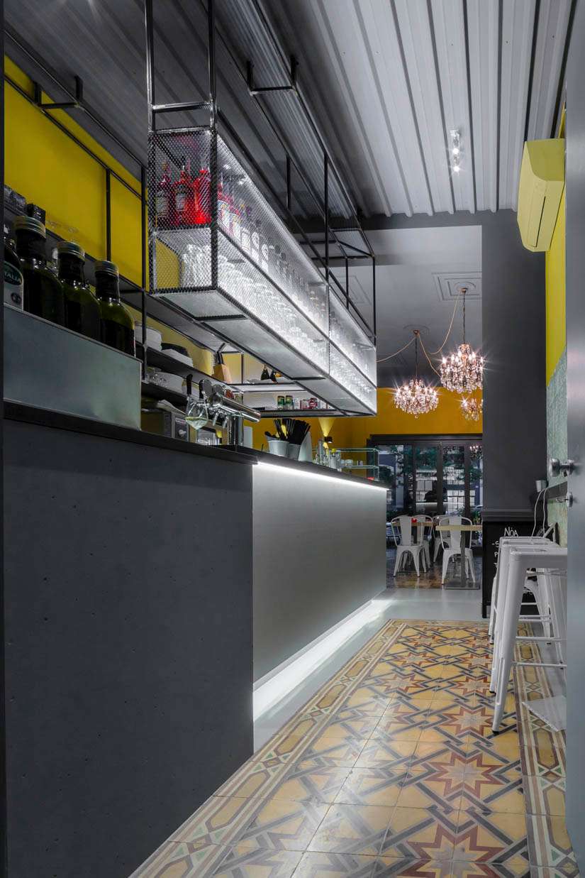 Lo spazio è un unico ambiente nel quale convivono sala, bancone e preparazione. Nella scelta del pavimento è stata utilizzata una composizione di marmette, provenienti da vecchi e originali rivestimenti milanesi; l’occasione ha reso possibile il posizionamento delle stesse con nuove combinazioni di texture.
